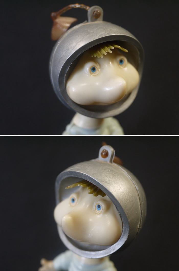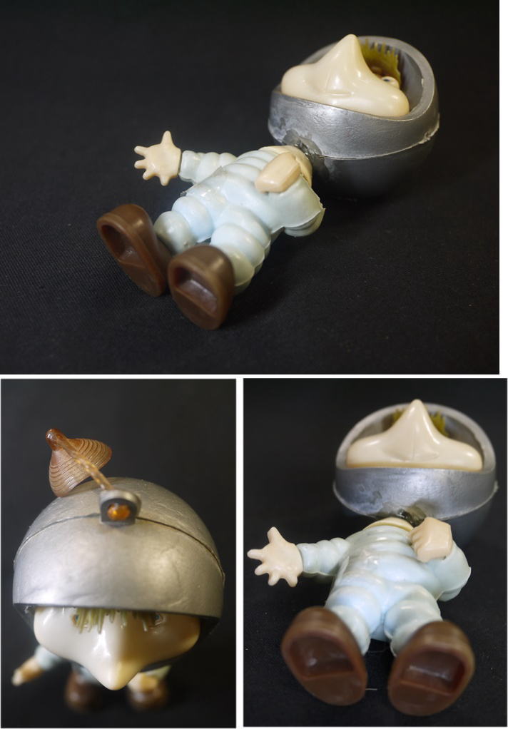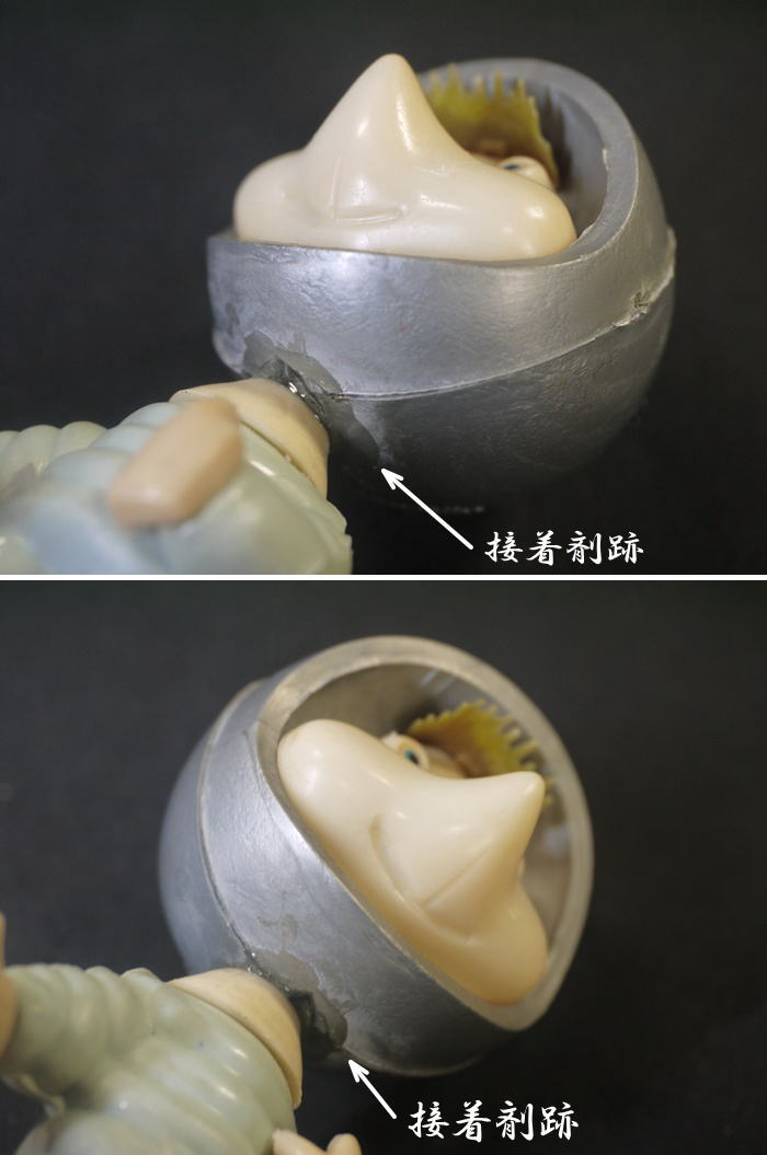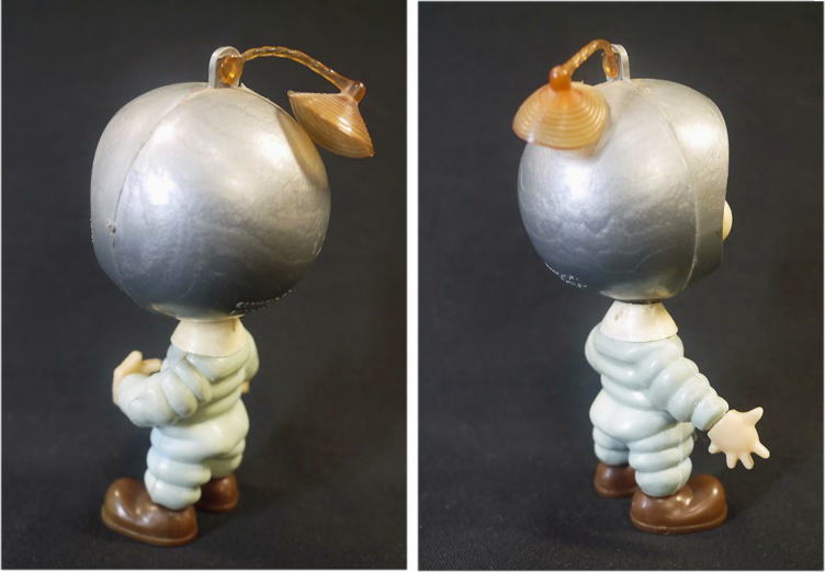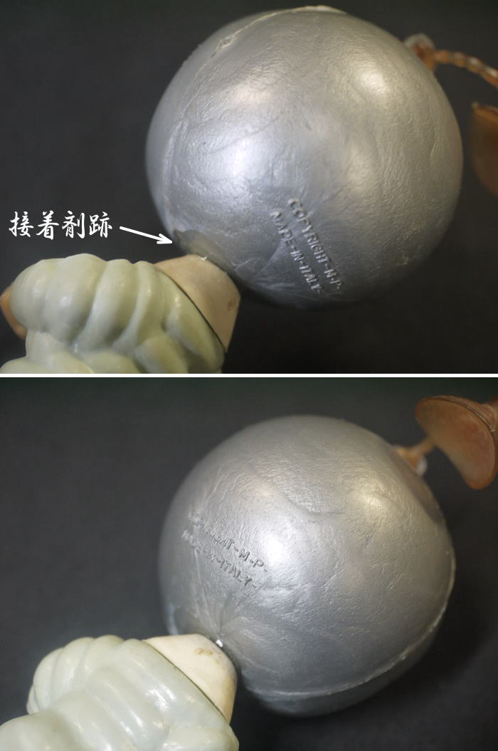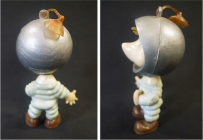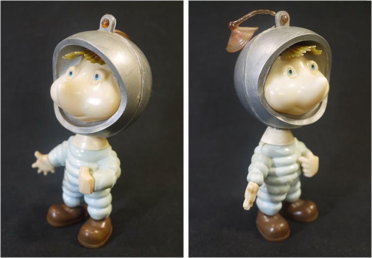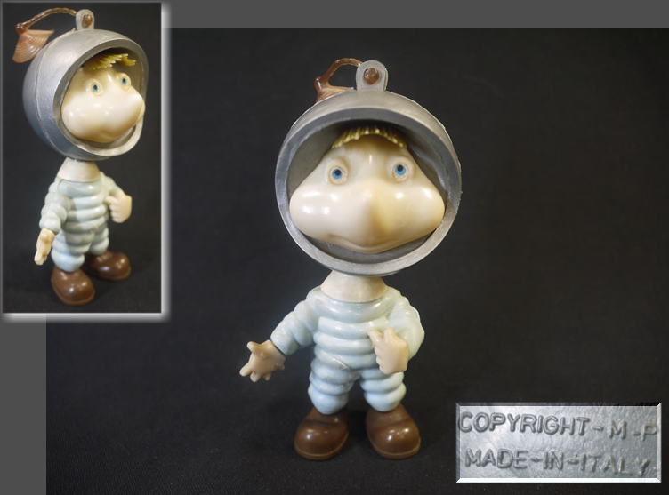 1960年代のソフビ製トッポジージョ シルバーのヘルメットと水色の宇宙服、頭部には吸盤が付いたビンテージフィギュアで アポロ計画などの時代背景を感じさせるバージョンです。 頭部と胴体が外れたのか頸の部分に接着剤跡があり 少し頭と胴が歪んでいるように見えます。 そのほか全体にヤケによる褪色が見られます。 箱は有りません。 高さ10.8cm 新着商品3000円
