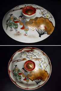 九谷の蓋物 蓋表には萬歳と松と白梅、 身には竹と亀、見込は可愛い椿が描かれた 新年に相応しいとてもお目出度い文様です。 身の口縁は輪花形、持ちやすく梅をかたどった蓋の摘みは愛らしい姿形です。 スレによる剥離はみられますがキズなく状態良好です。 身の口径13.5cm 身の高さ6.8cm 蓋の口径12.5cm 全体の高さ9cm 在庫なし