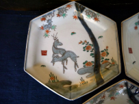伊万里色絵六角皿5客 鹿に紅葉文 秋深まるこれからの季節にぴったりの図柄です。 1客に4.5ミリのホツがあります(画像参照) 残りの4客はかすかなカマキズ以外は無傷です。 角から角の最大径18cm 1辺の長さ9cm 在庫なし