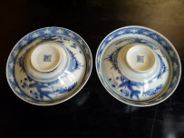 古伊万里染付蓋付茶碗2客です。 若松に竹梅と太湖石を描き 見込みは五弁花、銘は角渦福と 江戸中後期古伊万里の大変上手のものです。 残念な事に 1客の身と蓋にソゲ、 もう1客の身にニュウ、蓋にソゲが あります(画像参照)。 以上のキズの難有り品ではありますが 器形の美しさ、呉須の発色などをお愉しみ頂ければと存じます。 身の径11.4cm H5.5cm 蓋の径10cm 蓋をした時の全体の高さ7.5cm