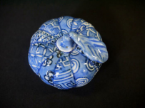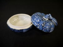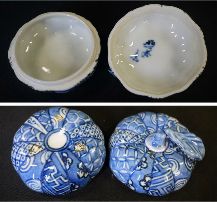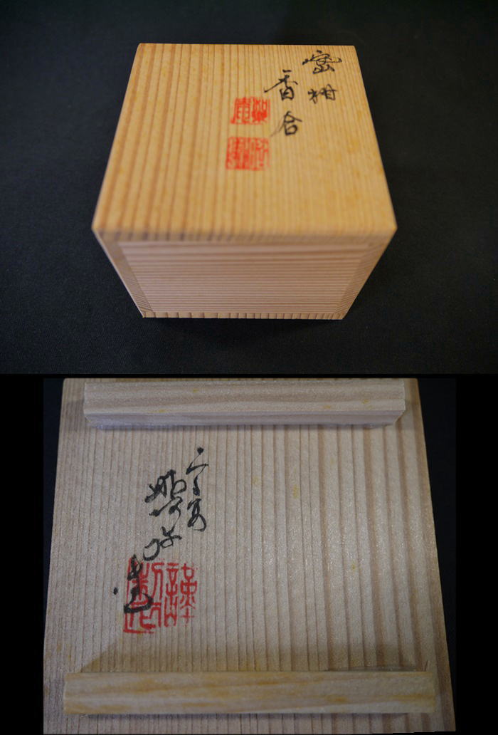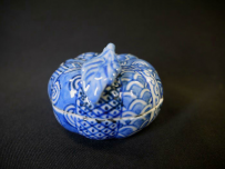 茶道具 染付による精緻な絵付の祥瑞手で 縁起の良い葉付き蜜柑をかたどった香合です。 美しい文様が人気で先日すぐにご売約となり続けて入荷したものでございます。 中古保管品ですが傷汚れなく状態良好な美品です。 共箱入り(箱の底裏にうっすら汚れがあります) 径5.8cm 葉までいれた高さ4cm 在庫なし