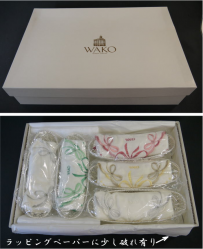 紙箱の中のラッピングペーパーに一部破れがあります)