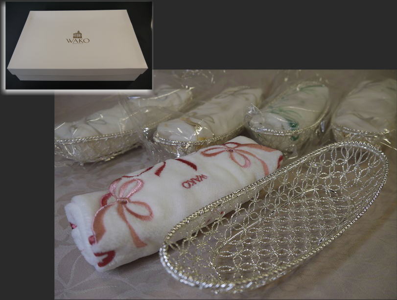 銀座和光 WAKO 銀細工 おしぼりトレイとハンドタオルのセット 5客です。