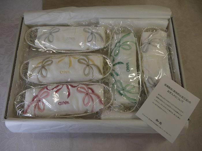 WAKOの刺繍が入ったリボン柄の可愛いハンドタオルもセットです。