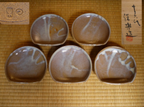 遠州七窯 上野焼第16代熊谷保興造 組皿5客です。 大胆な白釉と掻き彫りの笹文様が味わい深い景色となっています。 半月盆のような形は料理を盛り付けた際に品良く映えると思います。 サイズ 横径最大 14.5㎝ 縦径最大13㎝ H3cm 在庫なし