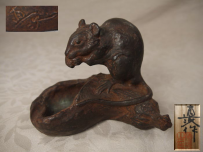 銅器 銅製 初夢に縁起の良い茄子と本年の干支のネズミの置物です。 灰皿ではないかと思いますがディテールにこだわった作行の良い作品です。 「直次」銘有り 共箱入り 経年による汚れ・緑青・赤錆が見られますが 大きなダメージなく概ね状態は良好です。 共箱入り 横最大12cm 縦最大8cm H9cm 在庫なし