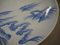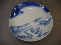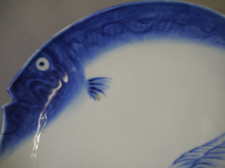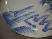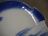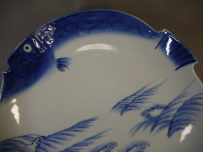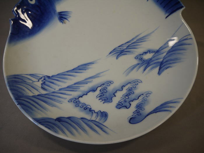 古伊万里 染付 一尺皿 河豚をかたどった中に白波が描かれています。 傷なく状態良好な美品です(目の右斜下の胸ヒレ近くにカマキズがあります) 裏は無地で目跡が一つ、全体的にすっきりとした雰囲気で盛り皿としては勿論 飾り皿としてもとても面白い大皿です。 30cm×30cm H5.8cm 新着商品6500円