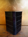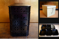 茶道具 天然木 黒漆塗 菓子器 五段縁高重 柿合塗 吉祥文の七宝透かし文が入っています。 中古品ですがキズ汚れなく状態良好な美品です。 紙箱入り(マジックで文字が書かれています) サイズ 16.5×16.5cm 重箱一つの深さ4.8cm 全体の高さ約25cm 在庫なし