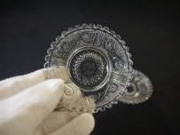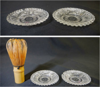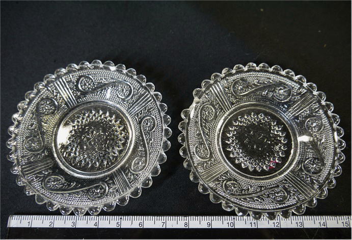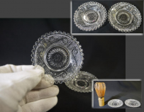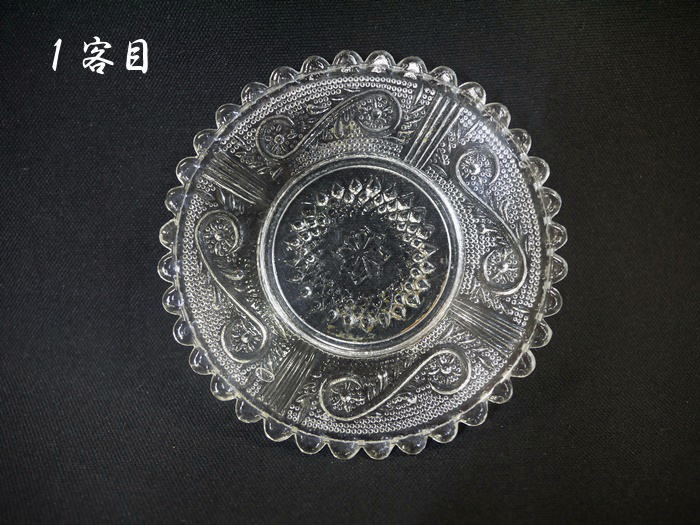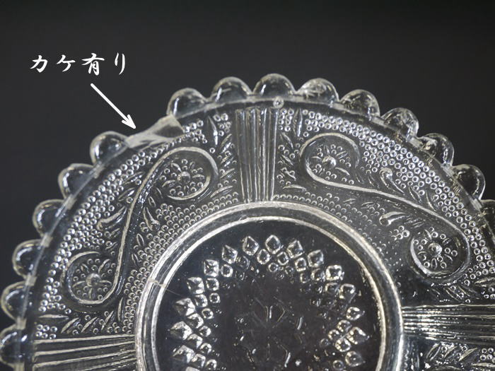 アンティーク 硝子の豆皿 2客 径約7cmととても小さく可愛いプレス硝子の豆皿です。 作りは昭和レトロのプレス硝子そのものですがあまりの愛らしさで ママゴトや雛道具として使われたものかもしれません。 1客は無傷ですが残りの1客の縁にカケがあります。 その他には目立つような傷はありません。 径約7cm H1.2cm 新着商品3000円
