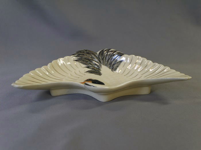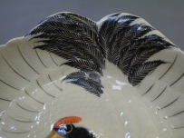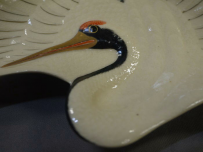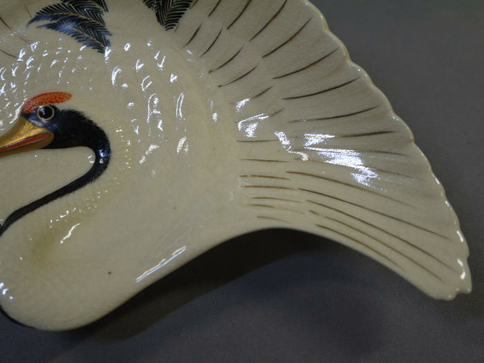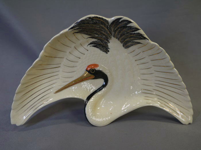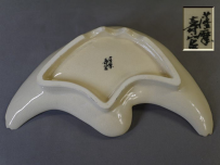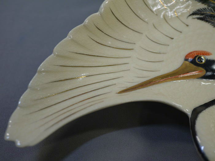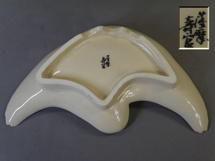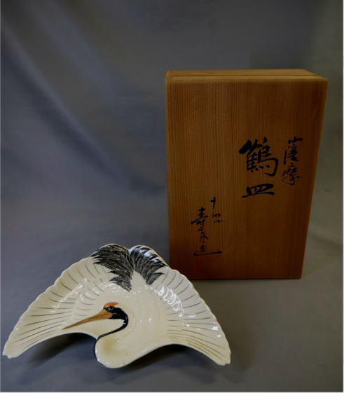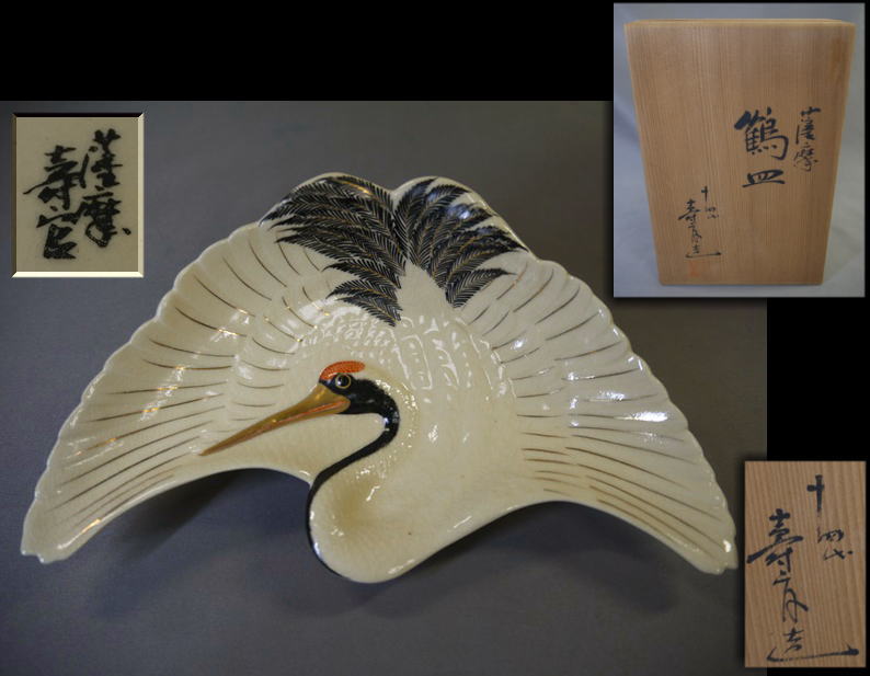 十四代 沈壽官造 薩摩焼 鶴皿 共箱入り 羽を広げて飛翔する鶴の姿を繊細な絵付けと細工で表現した格調高い作品です。 お正月などおめでたい晴れの席にお使い頂くのは勿論、 飾り皿としてもとても存在感があると思います。 欠けやニュウ等の傷なく状態良好 底裏に「薩摩 壽官」 銘有 サイズ 横最大約19cm 縦最大約11.5cm H4.2cm 新着商品12500円