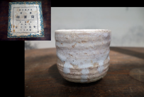 萩焼 野坂江月堂 筒茶碗 未使用保管品 右から文字の書かれた紙箱入りなので戦前のものだと思います。 ざっくりとした柔らかな風合いの陶土に たっぷりと掛かった藁灰釉が萩特有の得も言われぬ表情を楽しむ事が出来ます。 大振りなぐい飲みとしても又お愉しみ頂けると存じます。 割り高台の底裏に銘がありますが読めません。 サイズ H6.8cm 口径 7.3cm 高台外径4cm 在庫なし