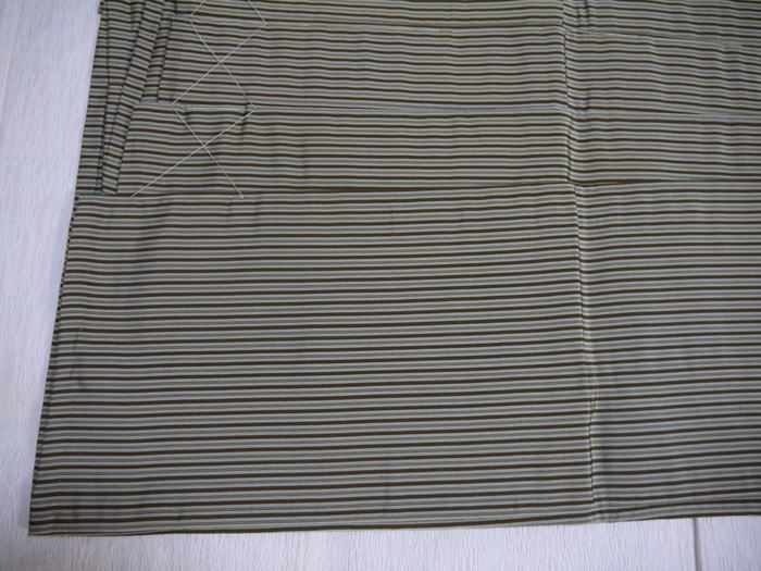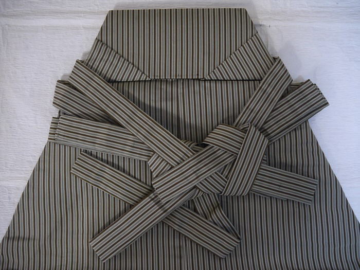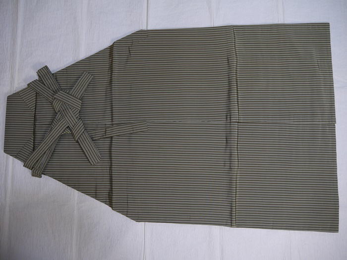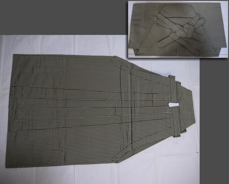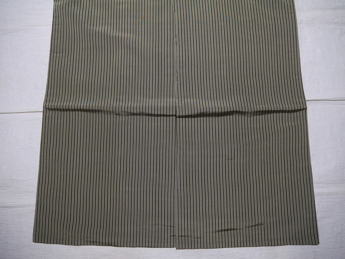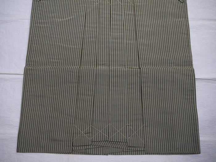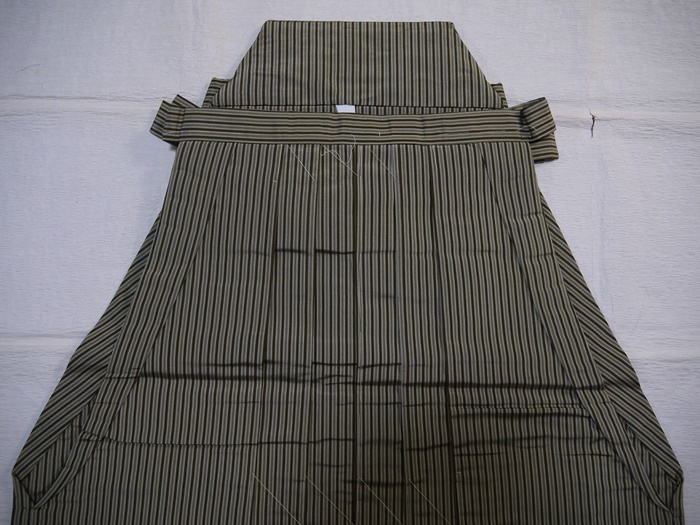 男物 正絹 行灯袴 渋いモスグリーンがかった地に茶縦縞文 紐下80cm しつけ糸がついたままなので未使用と思いますが紐にはしつけ糸が付いてなかったので 試着程度の着用はあるかもしれません。 傷汚れはございませんが長期保管品なので新品をお探しの方は その点ご了解の上でご検討下さいますようお願いいたします。 新着商品3500円