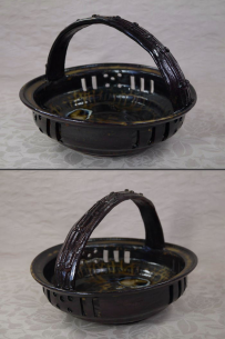 半窓庵不柳造の黒釉手鉢です。 力強い造形と吸い込まれるような釉薬の美しさが相まった素晴らしい作品です。 茶道具の菓子器としては勿論、飾って鑑賞してお愉しみ頂けるような逸品だと思います。 キズ・汚れ・使用感もなくほぼ未使用と思われる美品です。 共箱入り サイズ 23.5cm 22cm H17cm 在庫なし