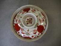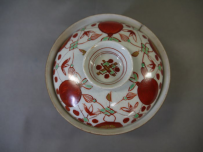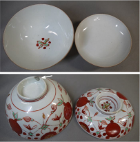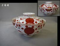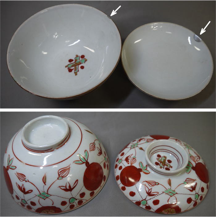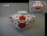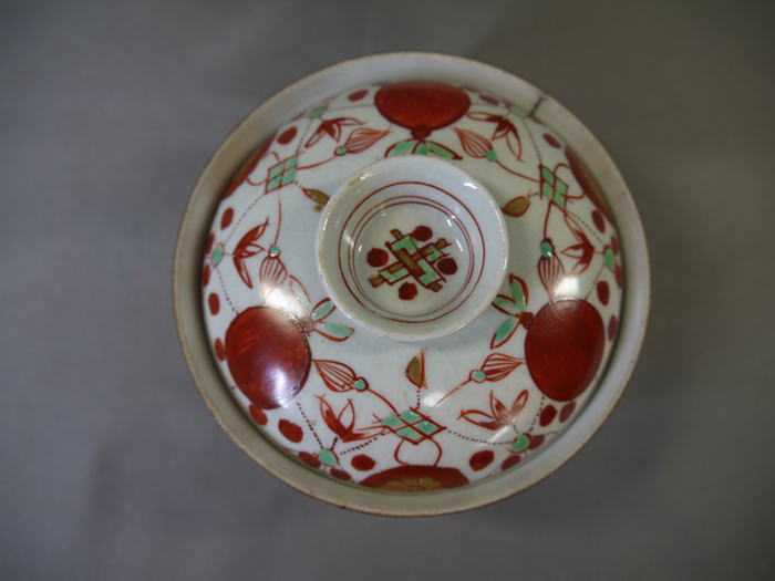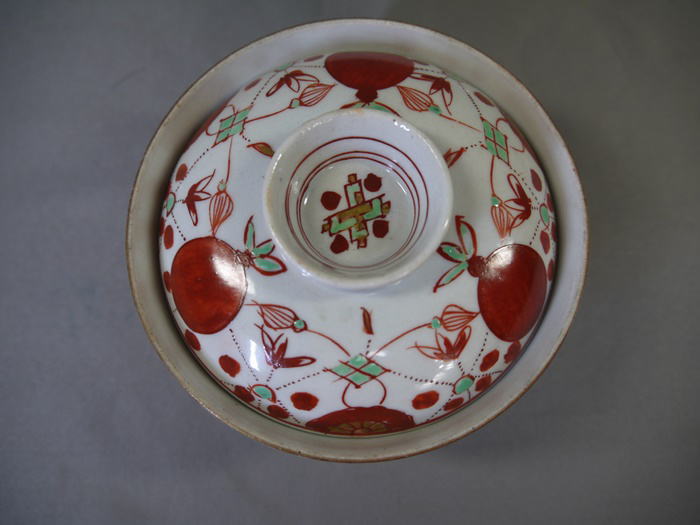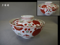 古伊万里 色絵の蓋付茶碗3客 縁起の良い赤玉と瓔珞文が余白なく描かれています。 茶碗の径11cm H5.5cm 蓋の径10cm 蓋をした時の全体の高さ7cm 1客目…蓋はキズ無・身の高台に本錫補修1カ所 2客目…蓋はキズ無・身の口縁から4cm~4.5cmのニュウを本錫補修 3客目…蓋と身に1カ所づつ本錫補修 新着商品3客2500円