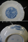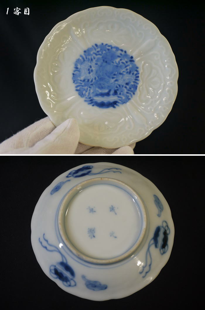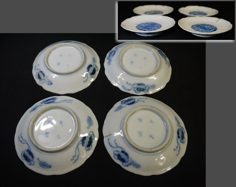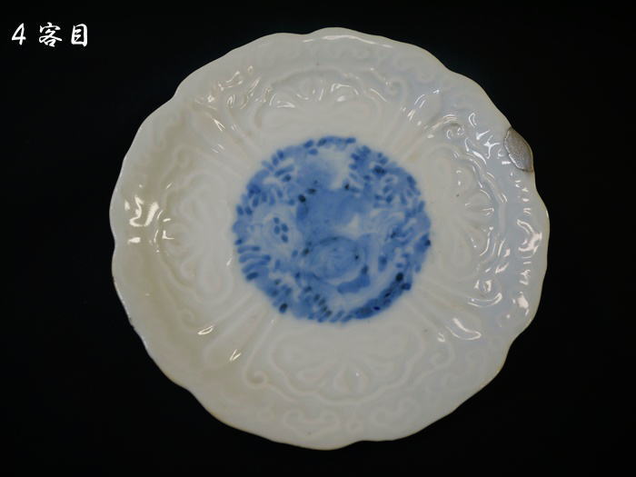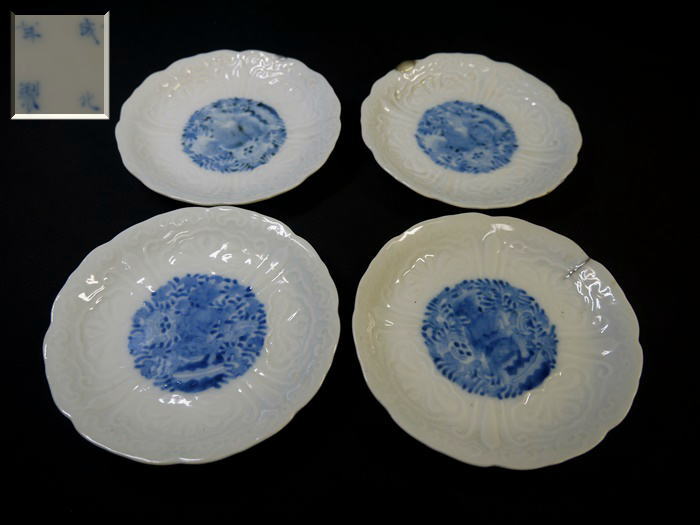 古伊万里 白磁染付 陽刻小皿4客 見込み玉乗り獅子 成化年製 本錫補修有 t-2536