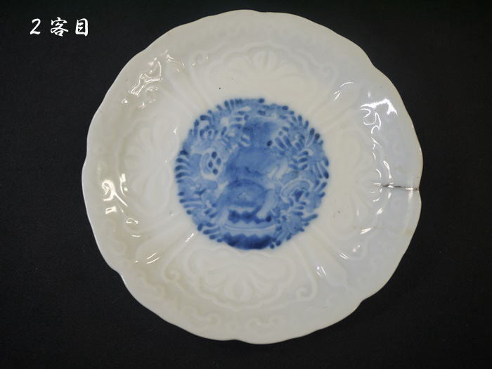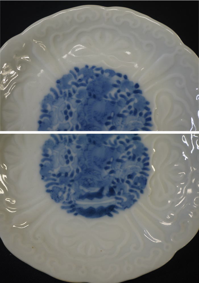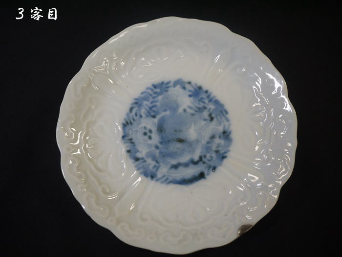 見込みには淡い呉須で玉乗り獅子が描かれそれを囲むように陽刻がほどこされています。