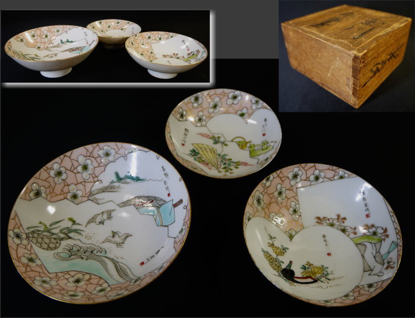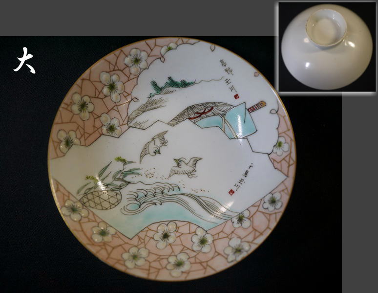 余白は淡いピンクの氷裂梅文で埋め尽くされ春らしい大変美しい盃です。