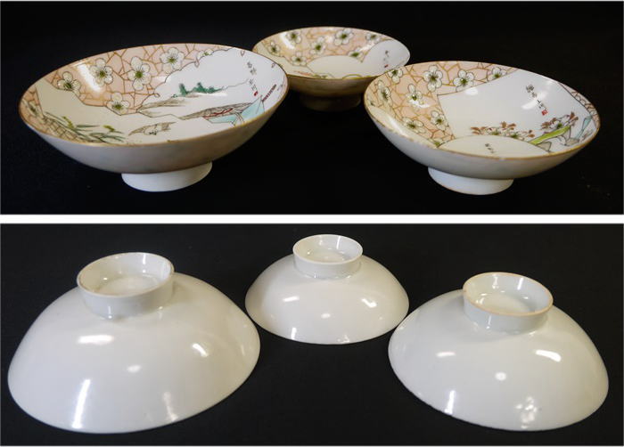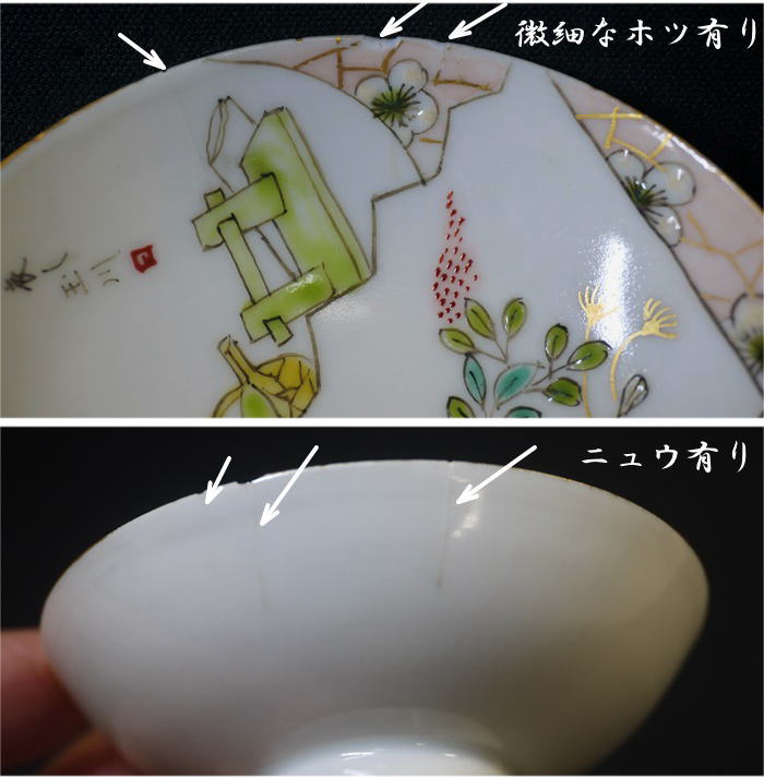 小の盃にのみ口縁に微細なホツが3カ所、そこからのニュウと他2カ所のニュウがあります(1.3cm~0.6cm)。