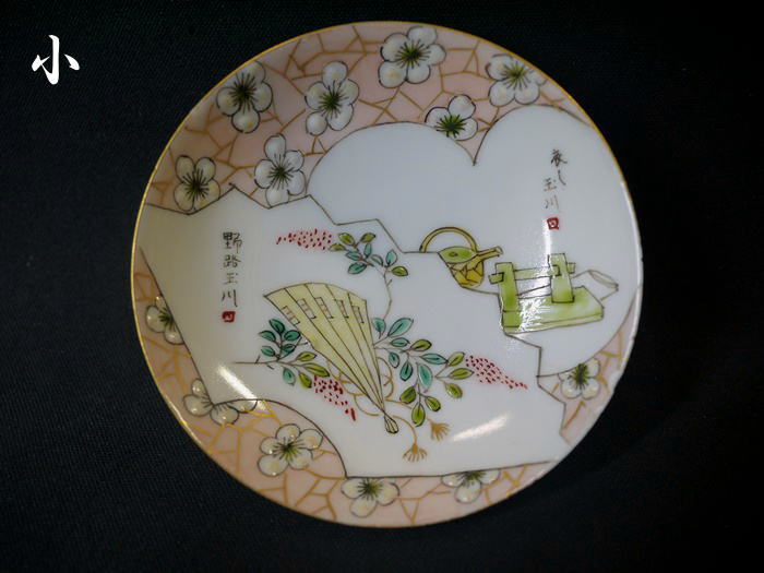 小の盃には「野路玉川」「衣ノ玉川」と扇、銚子が美しい色絵で繊細に描かれています。