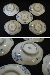 古伊万里 色絵 木瓜形豆皿5客 花唐草梅図 柿右衛門様式 在銘 二重角正 無傷完品 t-2173
