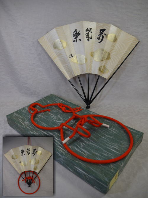 表千家14代而妙斎宗匠の大型飾り扇と組紐瓢型扇子掛朱色(共紙箱入り)のセットです。