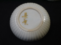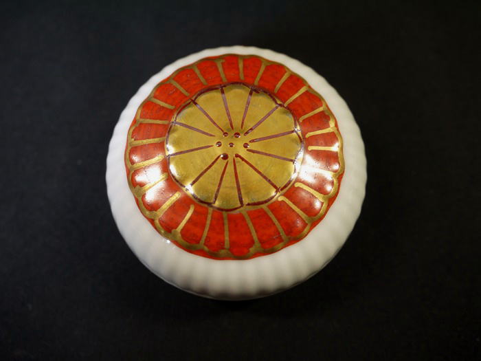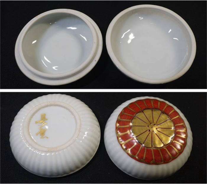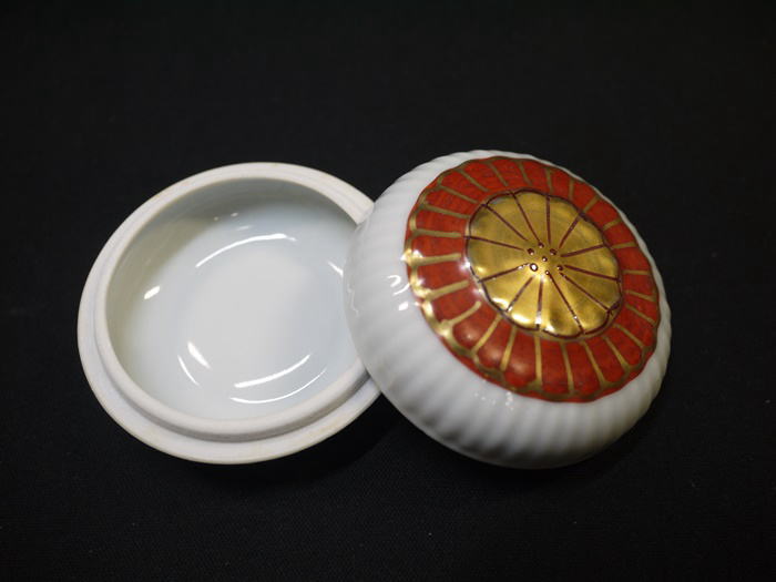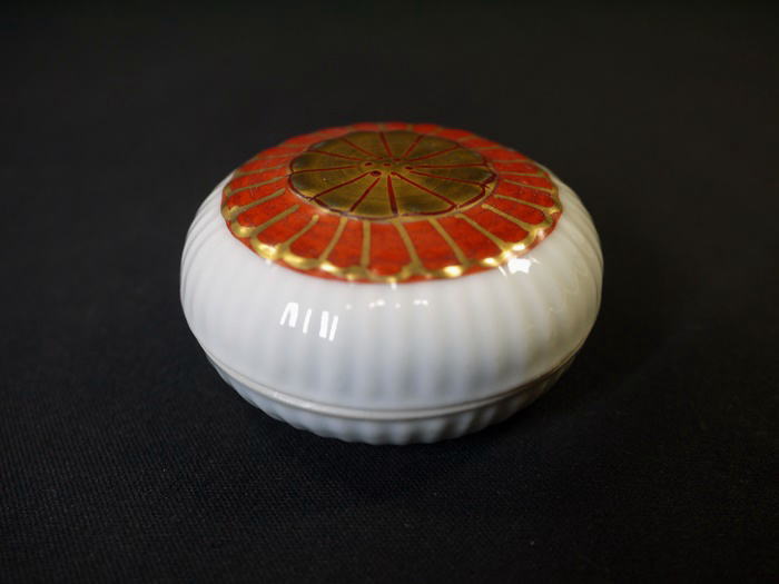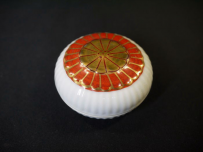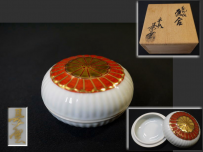 茶道具 香合 菊花文 平安景雲 共箱 白磁、朱、金彩を用いて格調高い菊花を表現しています。 傷汚れなく状態良好な美品です。 共箱(箱表にうっすらと汚れがあります) 径5.7cm H3.2cm 在庫なし