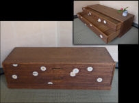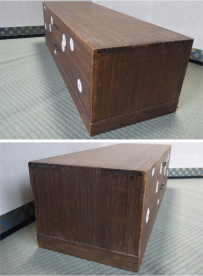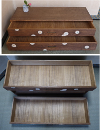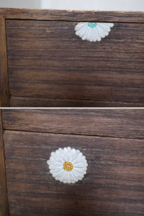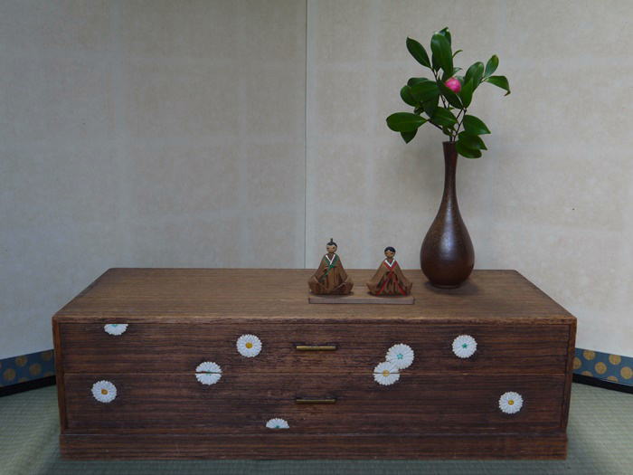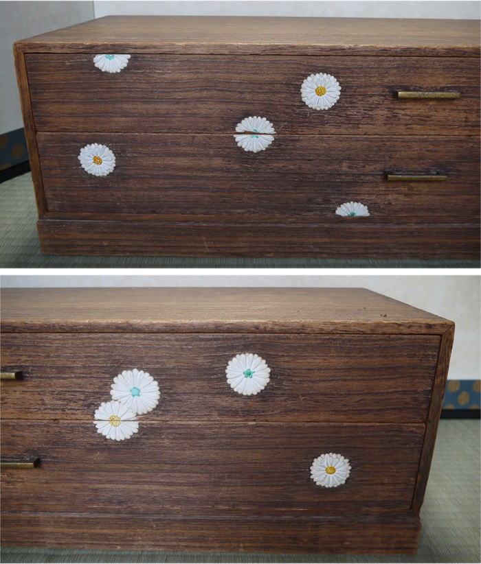 胡粉を塗り重ねて菊文様を立体的に盛り上げる装飾技法「菊置上」の二段箪笥です。