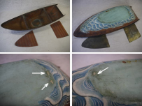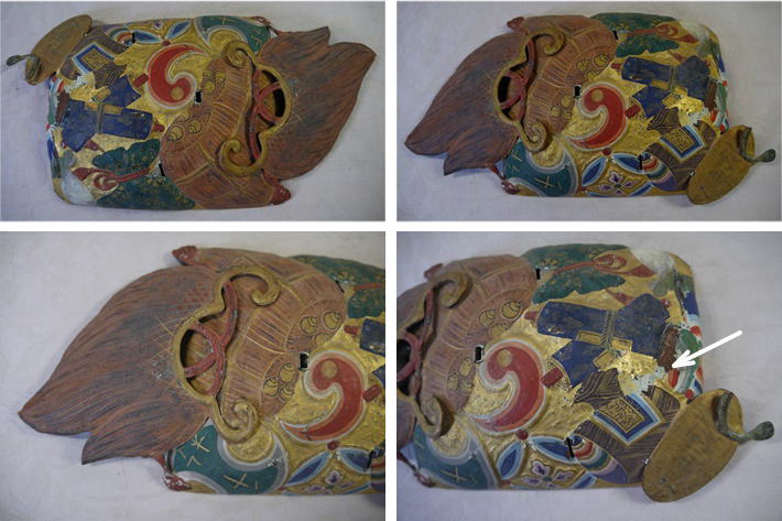 絵具の剥がれ多数(画像参照)や色褪せ、汚れ等の経年変化があり