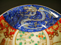 古伊万里 色絵鉢 側面にはダミの中に白抜きで描いた五爪の龍と雲を力強く描き 残りの部分には柔らかな色使いで竹林と鶴、 そして見込みには華やかに椿の花を描いた濃淡・強弱のコントラストが大変美しい鉢です。 裏面には沢瀉や葡萄文、余白には鱗文や亀甲など吉祥文尽くしとなっています。 口縁から約10cmほどのニュウが有り金補修(ブロンズ)しております。 他にはカケなどの傷はありません。 径18cm H6.2cm 在庫なし