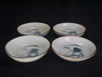 伊万里染付なます皿4客 見込みには遠山山水網干文が描かれ普段使いにぴったりの器です。 カマキズ、フリモノ等は所々見られますが 欠けニュウなどの傷無く状態良好です。 (1客見込みの一部にうっすらと赤いシミのようなものがあります、画像参照) 使い勝手の良いサイズ 口径13.6cm H3.4cm 在庫なし