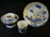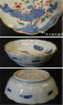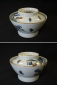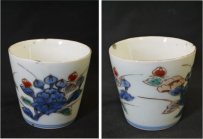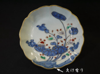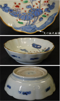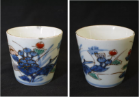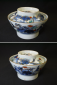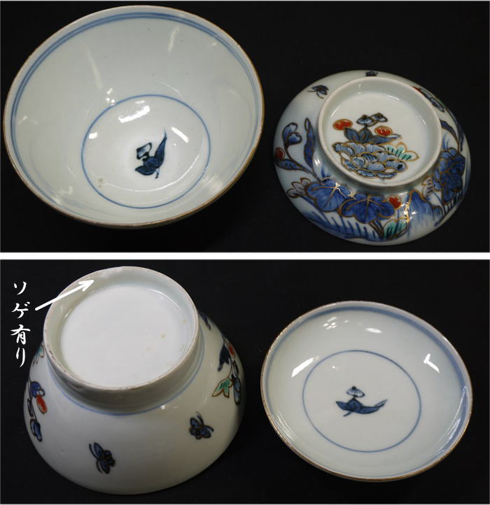 古伊万里 染錦草花文3点です。 ①膾皿…成化年製 縁の金彩に6ミリほどのソゲ有り 底裏高台に小アタリ2カ所 径17cm H5.3cm ②蓋付茶碗…底裏高台に約1.2cmほどの欠け有り 茶碗の径11.2cm H6cm 蓋をした時の全体の高さ8cm ③小ぶりな蕎麦猪口…口縁2カ所本錫補修有り 底裏高台にソゲ有 釉トビ窯傷有 3点とも小傷がありますがご使用には問題なくすぐにお使い頂けると存じます。 新着商品3点3500円