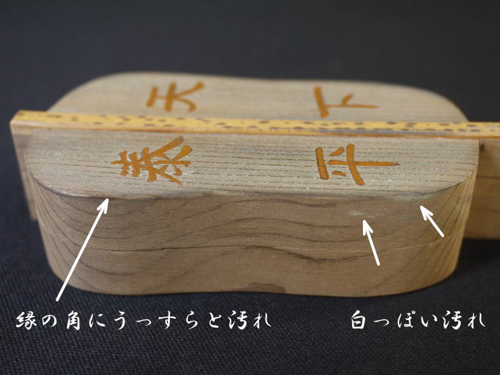縁の角に黒い薄汚れがあり側面や蓋を開けた内側にもうっすらと汚れが見られます(画像参照)。