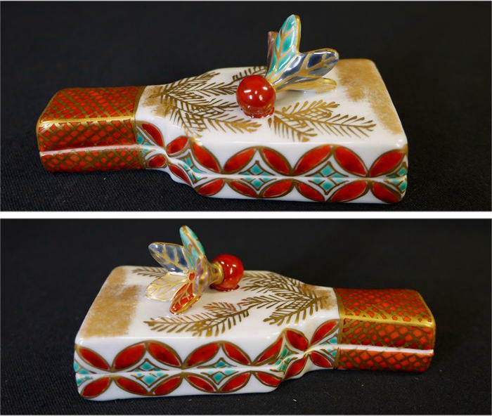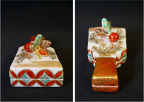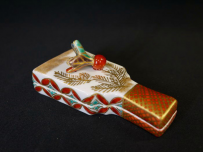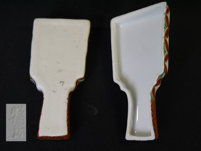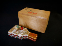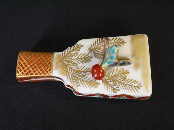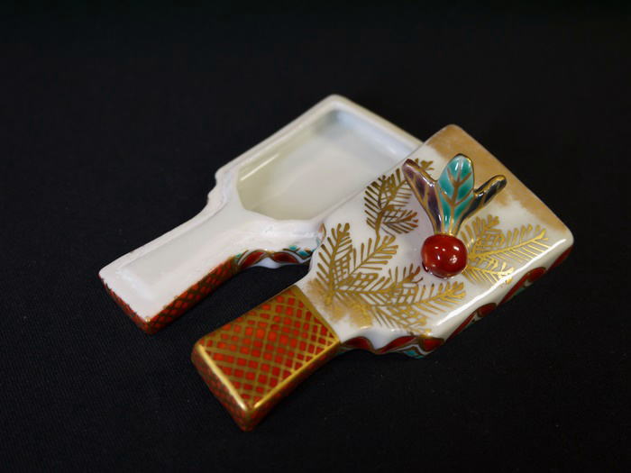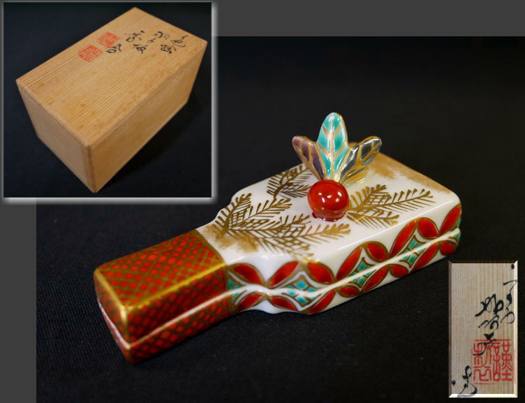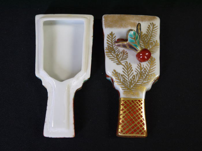 茶道具 香合 昭阿弥造 色絵 若松文 羽子板 羽根付 迎春に相応しい若松文、可愛い羽根付羽子板をかたどっています。 底裏にわずかな汚れが見られますが その他欠け等の傷なく状態良好な美品です。 共箱入り(箱にシミ薄汚れがあります) サイズ 横最大8.7cm 縦最大4cm H3.6cm 新着商品4750円