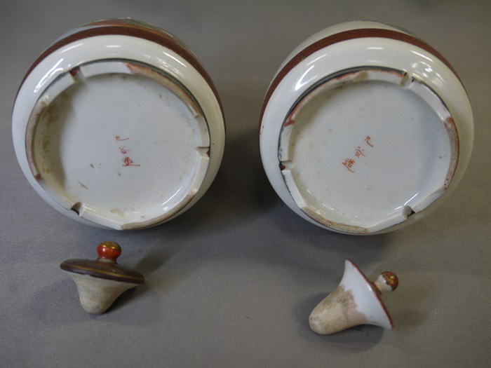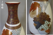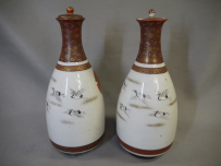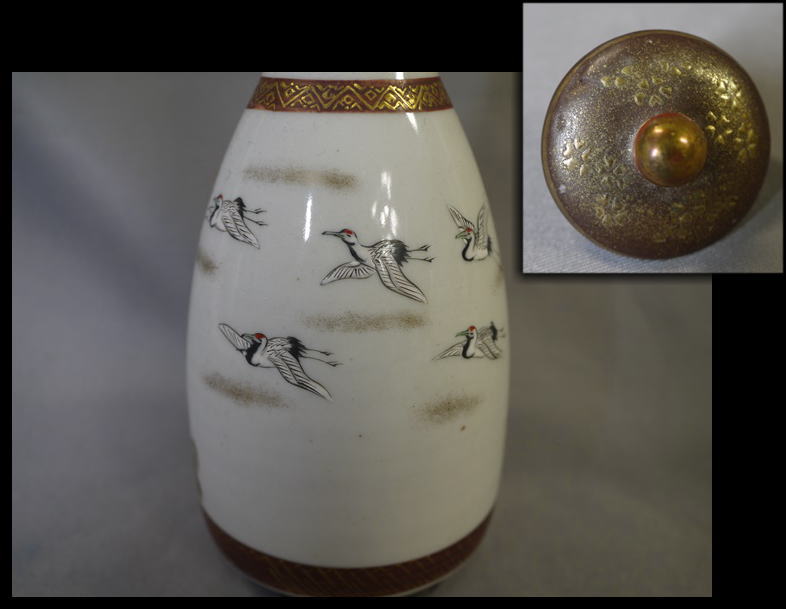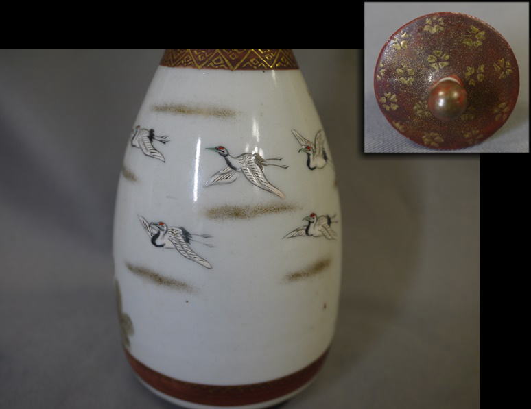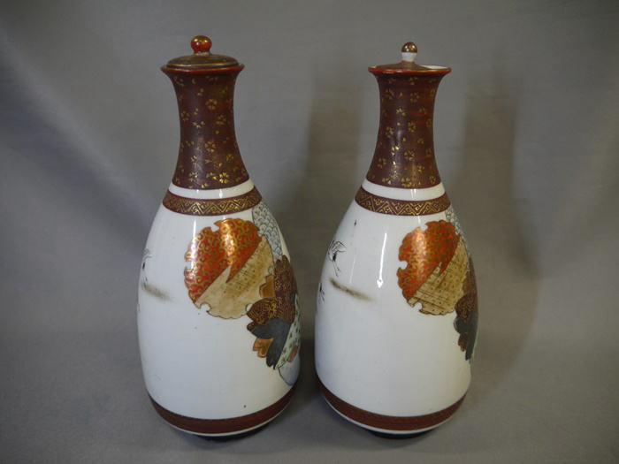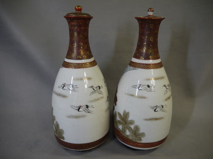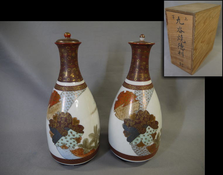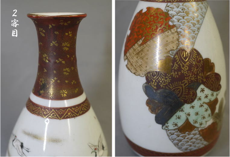 九谷焼 赤絵徳利一対 雪輪・桜・唐草・青海波・鶴 縁起良い文様 無傷 t-2548