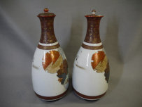 九谷焼 赤絵徳利一対 雪輪・桜・唐草・青海波など縁起良い文様が描き込まれ