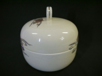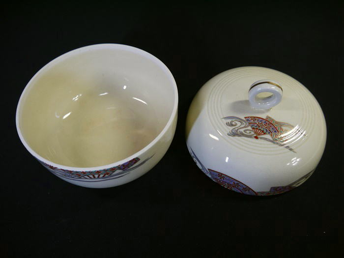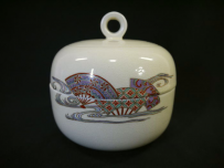 茶道具 京焼原平窯 仁清風扇流 蓋物 菓子器 ころんとした鈴のような愛らしい形に扇と流水が描かれた雅で美しい蓋物です。 目立つような傷汚れなく状態良好なお品です。 共箱入り(箱にはヤケ薄汚れ反りなどの経年感があります) サイズ 最大径13.5cm H13cm 新着商品1800円
