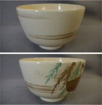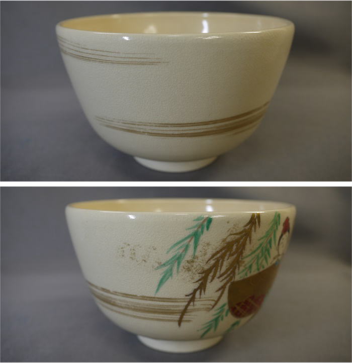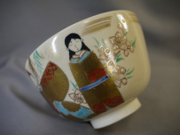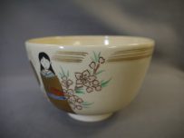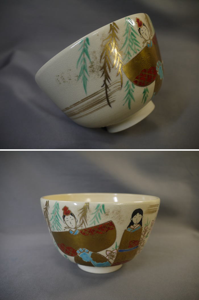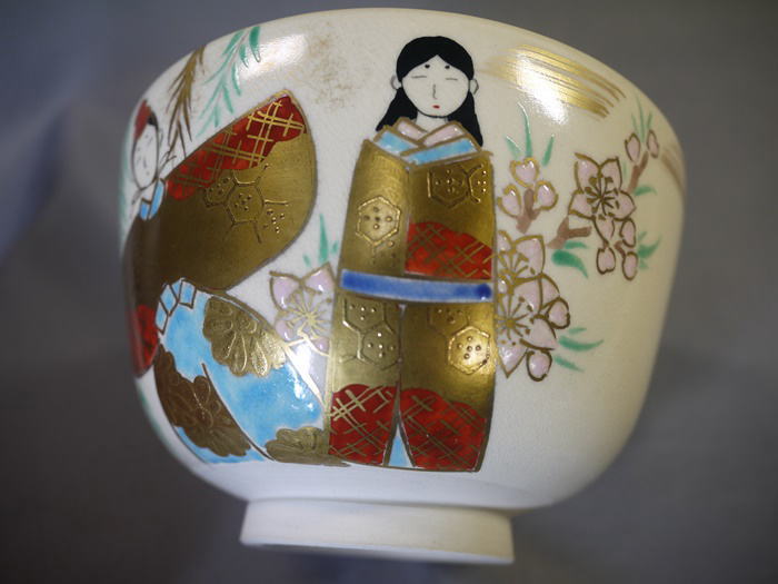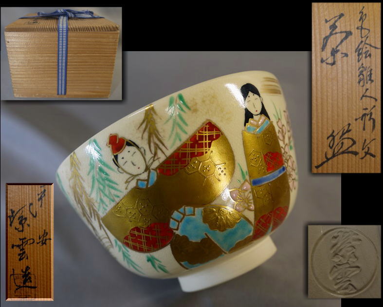 茶道具 抹茶茶碗 色絵雛人形文 平安紫雲作 色絵と金彩で可愛いお雛様と淡いピンク色の桜が描かれています。 中古保管品ですが傷汚れなく状態良好です。 共箱入(箱には小傷薄汚れ等の経年感が見られます) サイズ 口径12.1cm H7.6cm 高台外径5cm 新着商品2750円