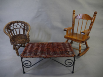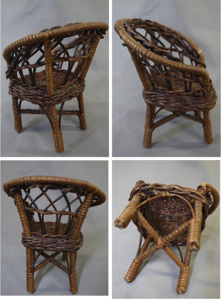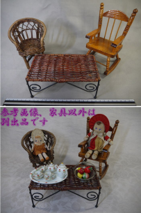 アンティーク ミニチュアドール用 家具 チェア椅子テーブル ドールハウス 昭和レトロ 目立つような傷みなく良好な状態です。 【木製ロッキングチェア】 縦10.5cm 横10cm H17cm 座面8cm×8.8cm 【籐のテーブル花台】 16cm×9cm×H7cm 【籐の椅子チェア】 横10cm 奥行9cmH13cm 座面6cm×5cm 前右脚が少し短くぐらつきがあります。 新着商品2500円