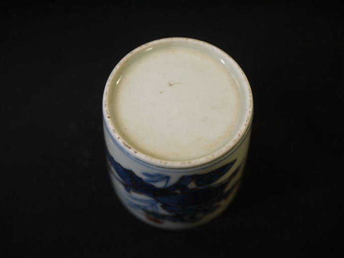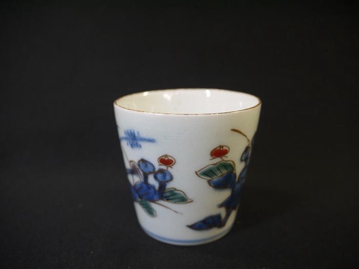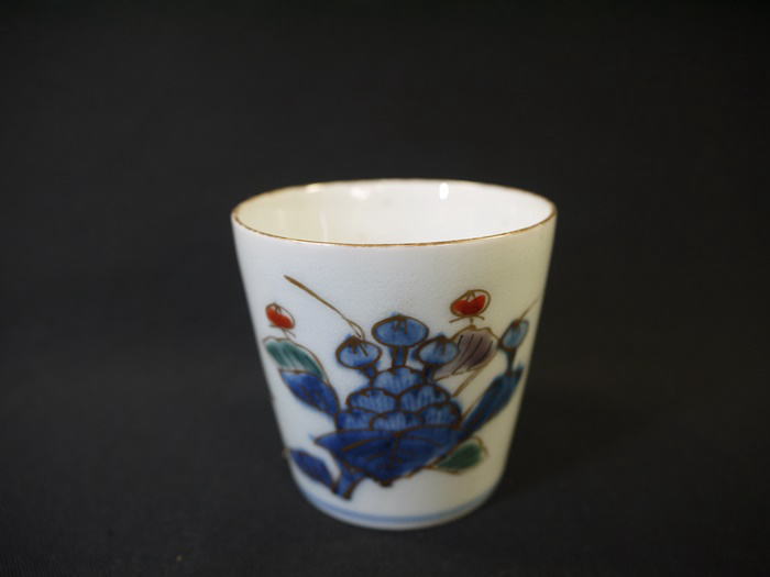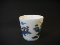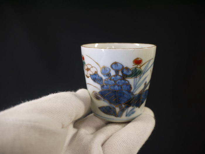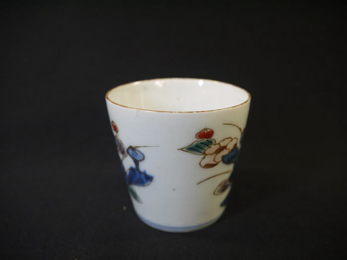 古伊万里 染錦 小ぶりな蕎麦猪口 色絵染付金彩で華やかな牡丹文が描かれています。 湯呑にもぐい飲みにもお使い頂けるサイズだと思います。 見込みに釉薬のトビ、高台にカマキズがありますが 欠けニュウ等の傷なく状態良好です。 径6.2cm H6cm 新着商品3000円