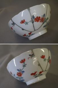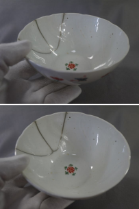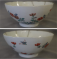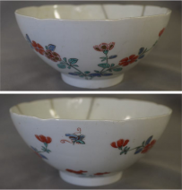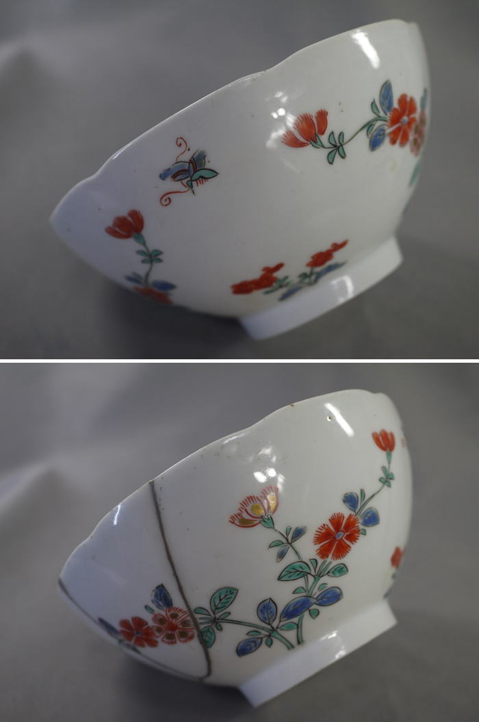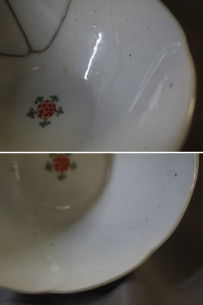 古伊万里 色絵 碗 鉢 柿右衛門手 撫子文 口縁は輪花で表はつるりとした碗なりですが 見込みは側面全体にぐるりと捻じり(画像では判りにくいですが)が 盛り上げで入っておりとても美しく珍しい器形です。 中央には色絵の五弁花が細密に描かれ延宝様式の柿右衛門手と思います。 大きく本錫の直しがありますがその他には傷はありません。 サイズ 口径12.8cm H6cm 高台外径5.3cm 新着商品10500円