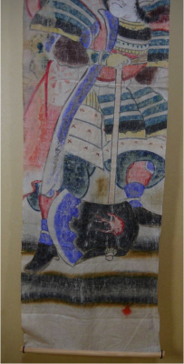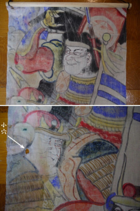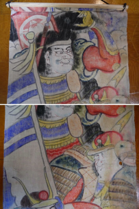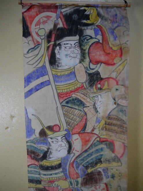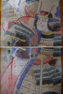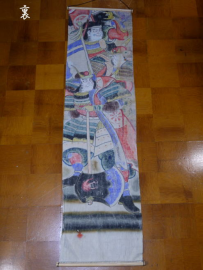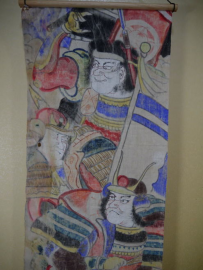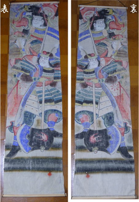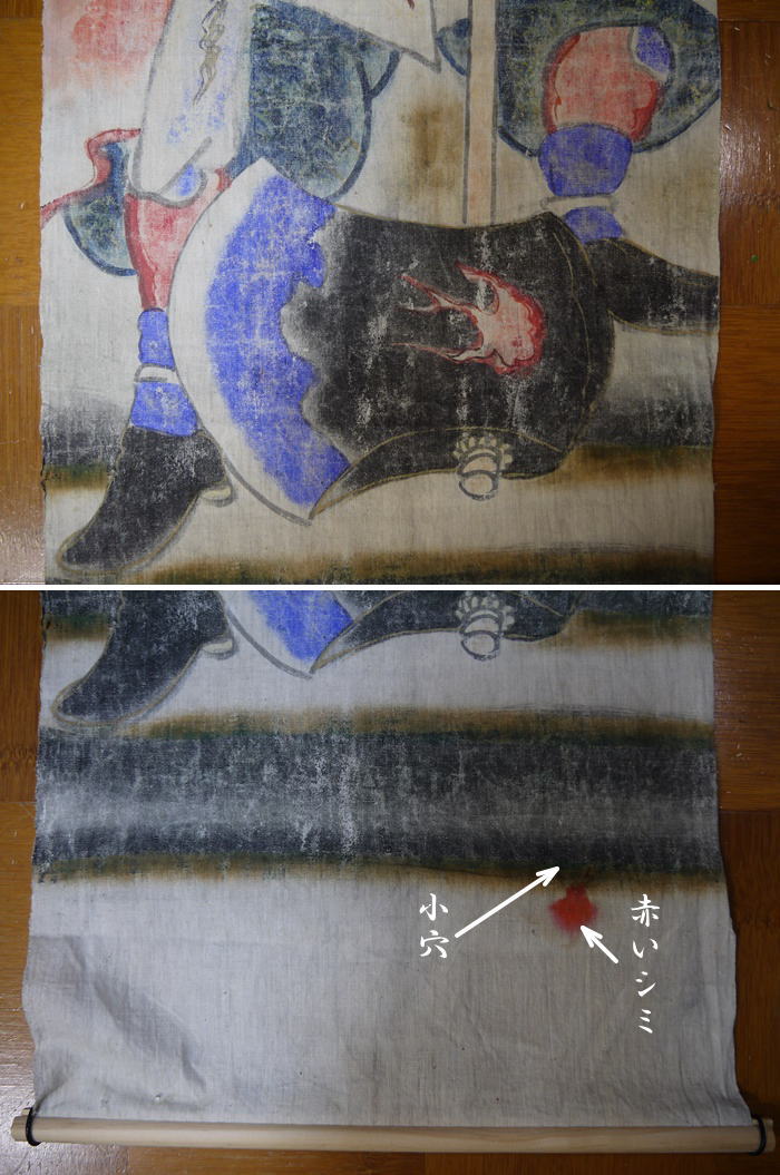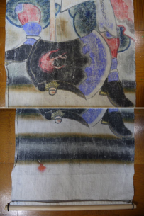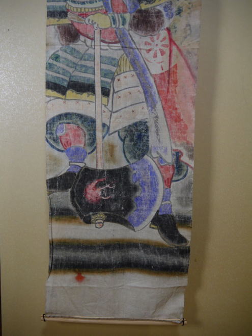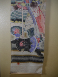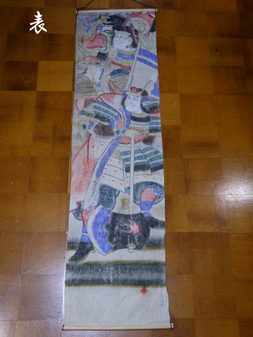 古布 木綿 古い武者絵の幟旗 武者三人と鉞(まさかり)等が描かれた勇壮で力強い図柄です。 経年による色褪せ・小穴(2カ所)・シミ・汚れなどがありますが それらも時代を経た味わいとしてお楽しみ頂ければと存じます。 オマケとして付属する細い円筒形の横木に上下の端を挟み込めばタペストリー風に飾れます。 五月のお節句にぜひいかがでしょうか。 サイズ 長さ149cm 巾38cm 在庫なし