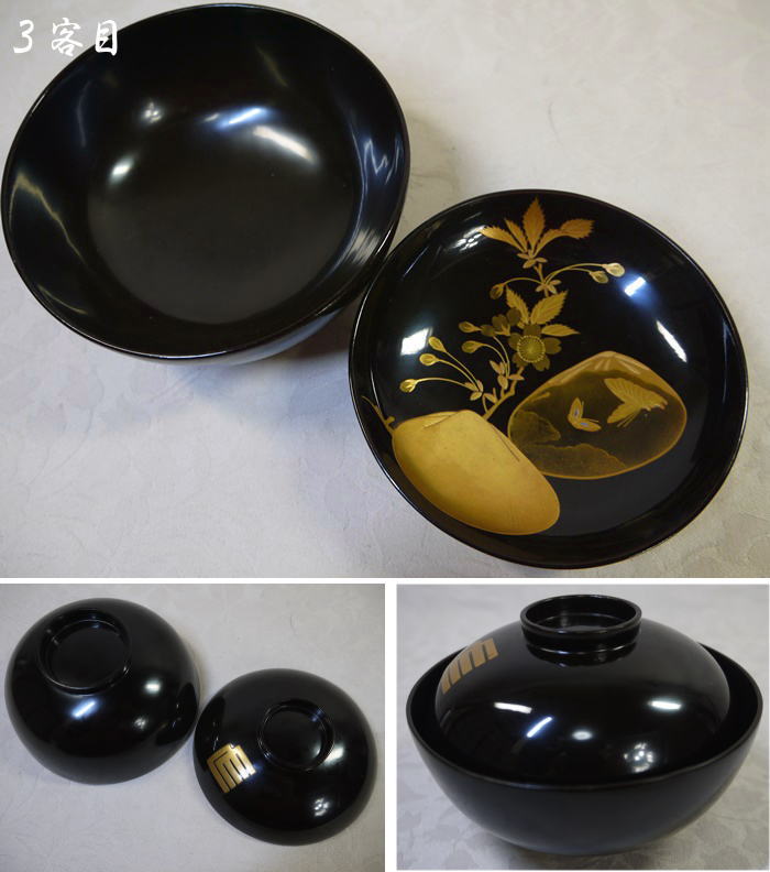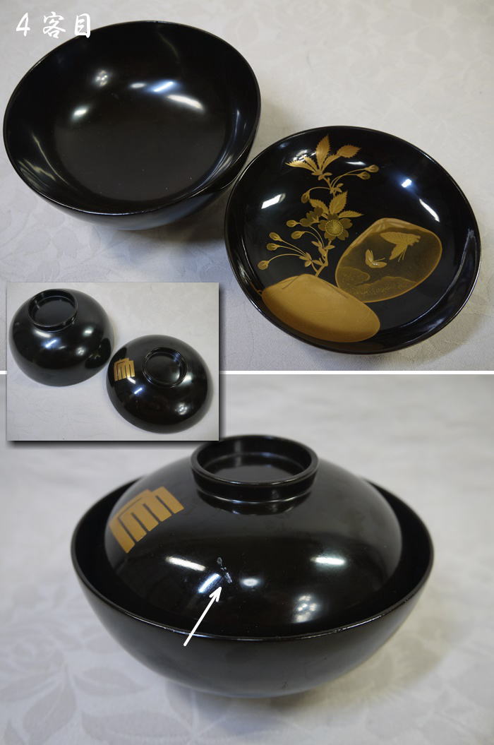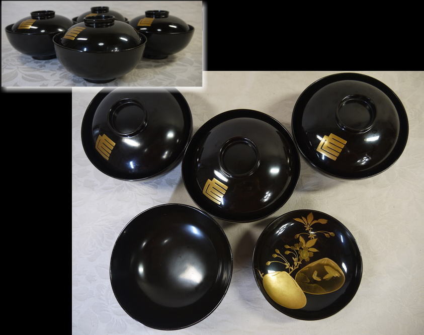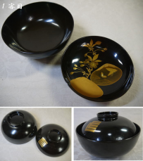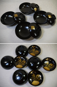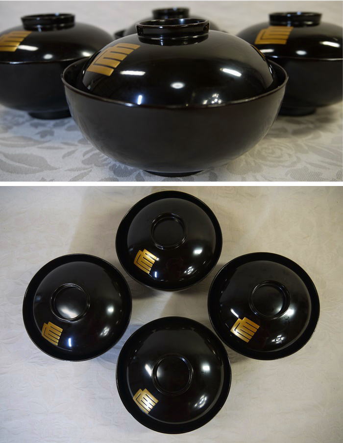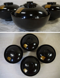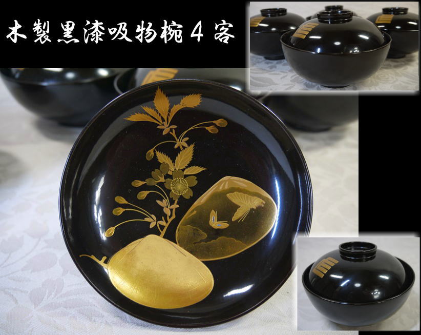 天然木製 黒漆金蒔絵の吸物椀汁椀4客です。