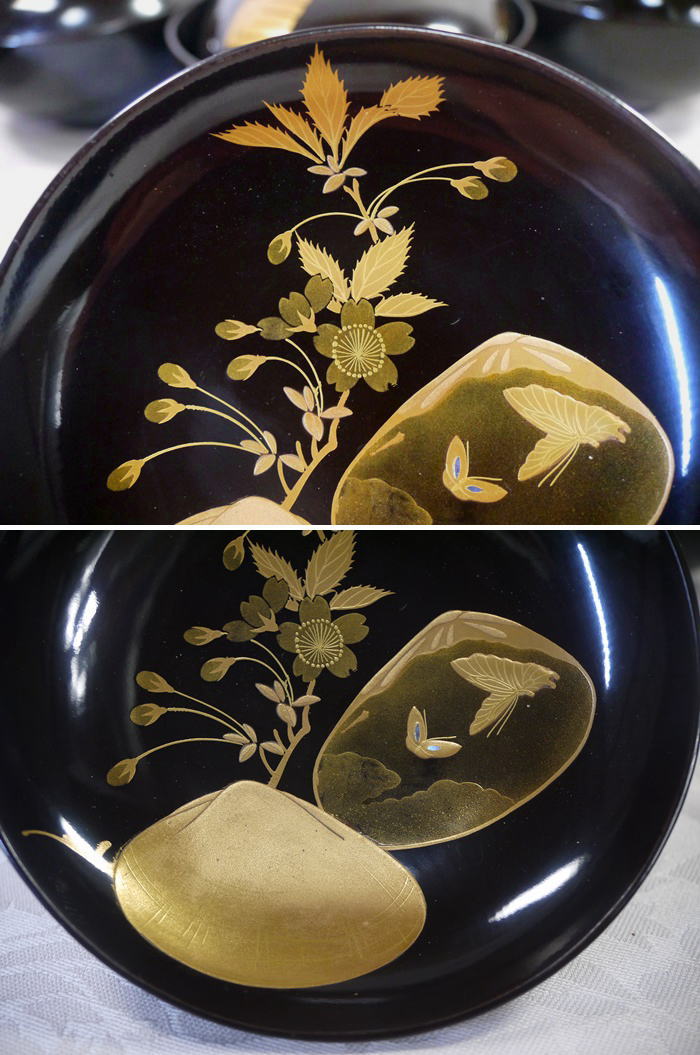 蓋を開けると金蒔絵梨地で蛤桜蝶などの大変美しい文様が細密な筆致で描かれています。