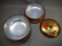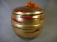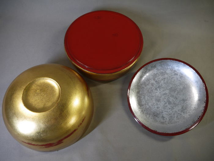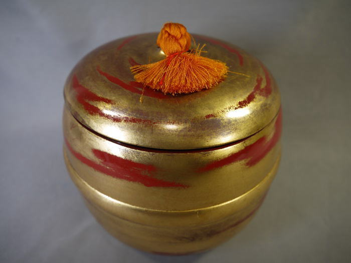 茶道具 漆芸 金の鈴をかたどった二段菓子器 愛らしい房付ですが房の色にヤケが見られ糸の乱れがあります。 金彩で内銀ですが金銀のスレやカスレがあり経年感が見られます。 大きなカケやワレなどの傷はなく高島屋の古いロゴが入った共箱入りです。 (箱にはヤケ薄汚れ反りなどの経年感があります) 下の段 口径16cm H7cm 上の段 口径14.3cm H5.6cm 房も入れた全体の高さ17cm 在庫なし