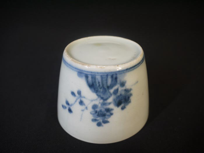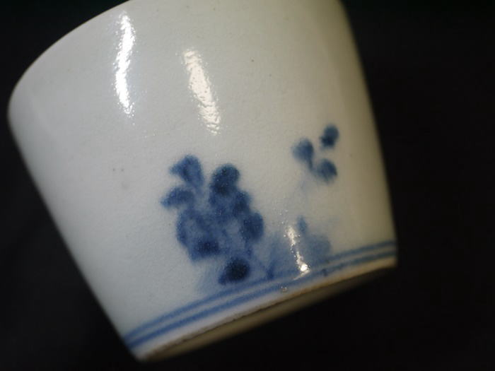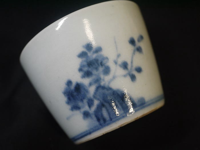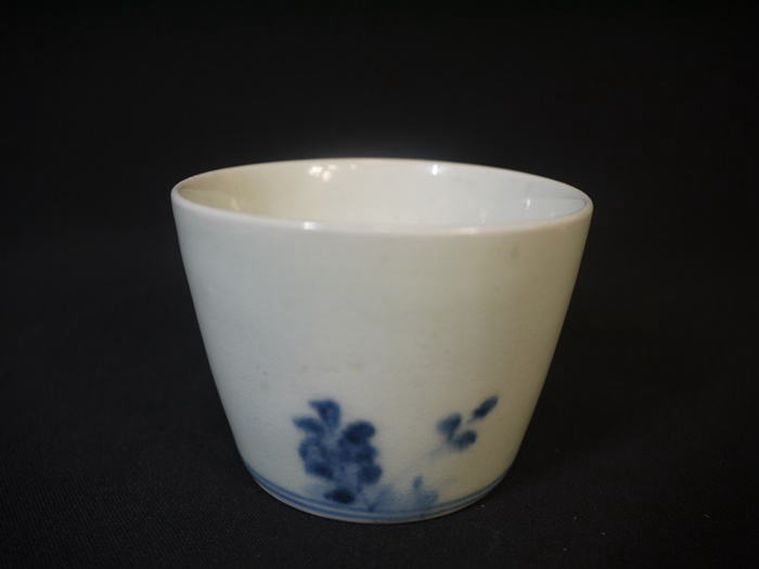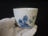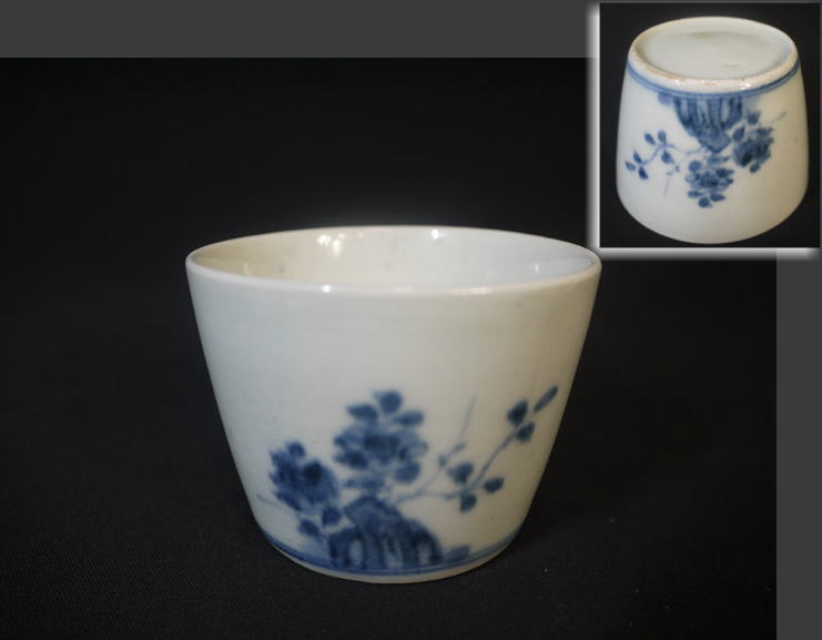 古伊万里 蕎麦猪口 染付 折枝花卉に太湖石が描かれています。 呉須がやや流れており桜か椿ははっきりと判りません。 欠けニュウなどのキズなく状態良好です。 口径 7cm~7.4cm(上から見た時に正円ではなくやや楕円がかっています) 高さ5.4cm 在庫なし