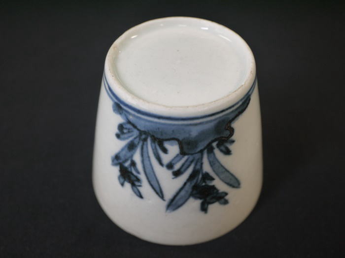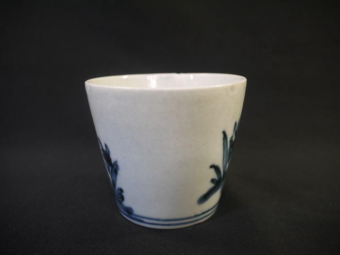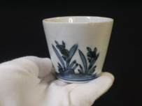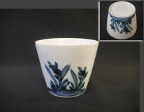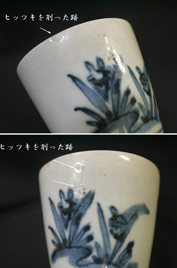 古伊万里染付 水仙文の蕎麦猪口です。 前後に水仙が描かれ裾は二重圏線。 口縁に蛤状のソゲ(画像矢印)有り、 おそらくフリモノと思われるカマキズを削ったような微細なスリキズ(画像矢印)有り、 裏底高台に微細なホツがありますが 目立つようなカケやニュウはなくすぐにお使い頂けるコンディションです。 新着商品2500円