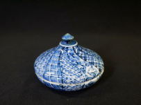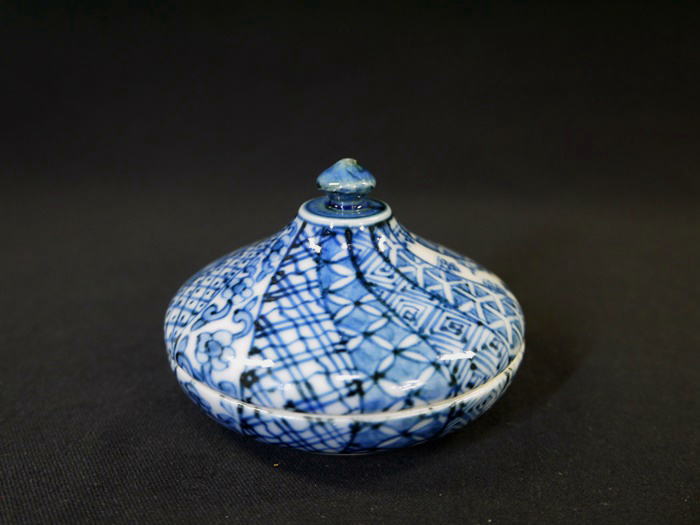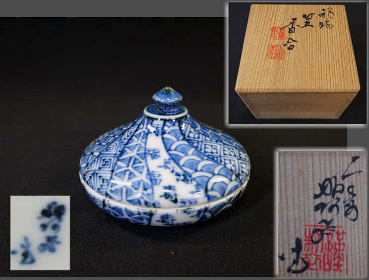 茶道具 香合 平安昭阿弥造 祥瑞手の笠をかたどったものです。 笠は末広がりの形から縁起の良いものとされ 開運、厄除け、家内安全、商売繁盛などの意味が込められています。 蓋内側の無釉の縁にかすかなヘコミのようなものがあります(9枚目画像)。 元からのものか使用によるものか判りませんが殆ど分からない程度と思います。 その他には傷汚れなく状態良好な美品です。 径6.5cm H4.5cm 新着商品2500円