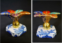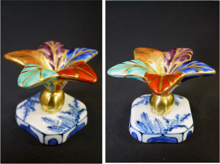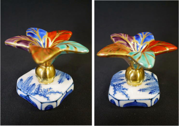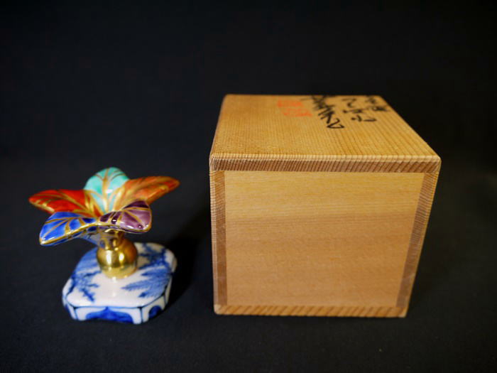 茶道具 蓋置 色絵 つくばね 平安昭阿弥造 美しい五色の羽根と金色の玉、台は染付の松梅が描かれた 京焼らしいとても美しいつくばね形の蓋置です。 傷汚れなく状態良好な美品です。 染付台のサイズ4.6cm×4.5cm H5cm 共箱入り 新着商品4200円