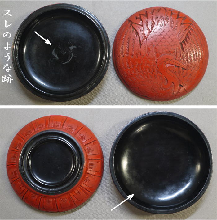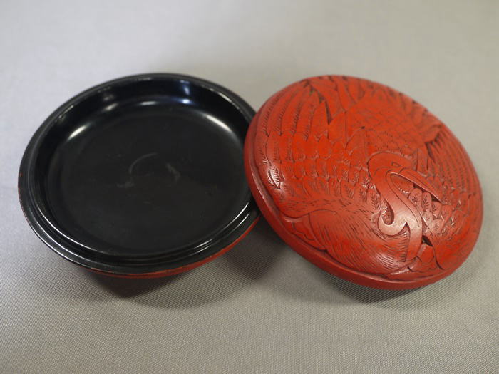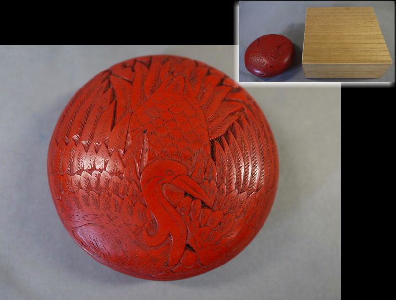 茶道具 漆芸 堆朱 香合 大きく羽根を広げ羽ばたく鶴の姿を緻密な細工で表現しています。 中古保管品 表には傷はありませんが蓋を開けると蓋・身ともにスレのような使用感があります。 他には欠け等の傷はありません。 箱はないのでサイズの合う木箱に入れての発送となります。 サイズ 径6.5cm H2.5cm 新着商品1500円