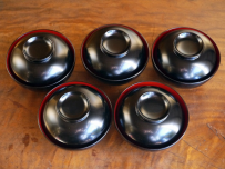 輪島塗 五島屋謹製 無地 汁椀五客です。 蒔絵がほどこされていない漆本来のしっとりとしたマットな漆黒、 すべてを削ぎ落した職人技がうかがえる逸品だと思います。 五客とも漆の剥離・引っかき傷など見られず 殆ど使用感のない状態良好な美品です。 (「輪島塗汁椀」と書かれた箱表に薄汚れと引っかき傷が見られます) サイズ 椀の口径12cm H6.5cm 蓋をした時の高さ9.5cm 在庫なし